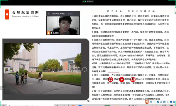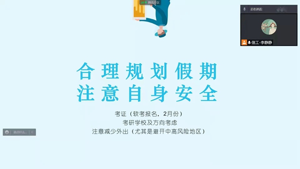 首先,各班辅导员强调,当前疫情防控正处于关键时期,我们一定要提升自我的安全防范意识,筑牢安全思想防线。同学们要继续保持警惕心理,科学佩戴口罩,谨记少聚集、戴口罩、勤洗手、多通风等基本防疫要求,牢记常态化疫情防控下的安全防范知识与注意事项,做好长期防护准备,关注时事新闻,不要隐瞒个人行程。我们要以积极的心态面对疫情,不信谣、不造谣、不传谣,坚决维护好前一阶段所取得的来之不易的疫情防控成果,不给疫情防控工作“添堵”! 另外,辅导员老师们也鼓励大家做好假期规划,保持积极的生活态度,多读书、读好书;规律作息,加强体育锻炼,劳逸结合,注重用眼卫生,养成良好的生活习惯,适当参与家务劳动。
