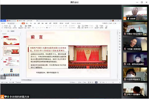 第二讲党课的主题是《党的百年奋斗重大成就和历史经验--深入学习贯彻党的十九届六中全会精神》,党课开始前李老师对每一位同学表示欢迎与祝福。随后李老师带领同学们深刻领悟感受党的第十九届六中全会的精神与内涵,给同学们详细讲解党要召开的每一项重要会议的历程时间,事项等,也给同学们科普了很多关于党对道路的探索和党的历史故事。