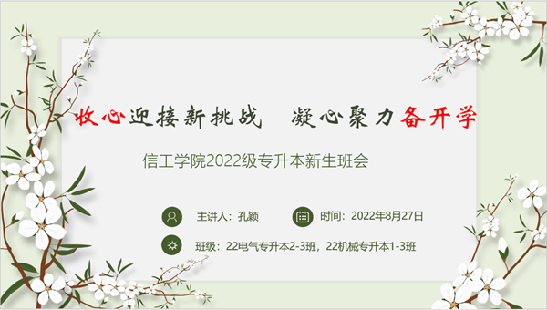 开学伊始,明志收心。为了营造良好的学习氛围,使全体学生尽快进入学习状态。8月25日至28日,信工学院各班辅导员以“线上+线下”相结合的方式开展了以开学收心为主题的教育班会活动。