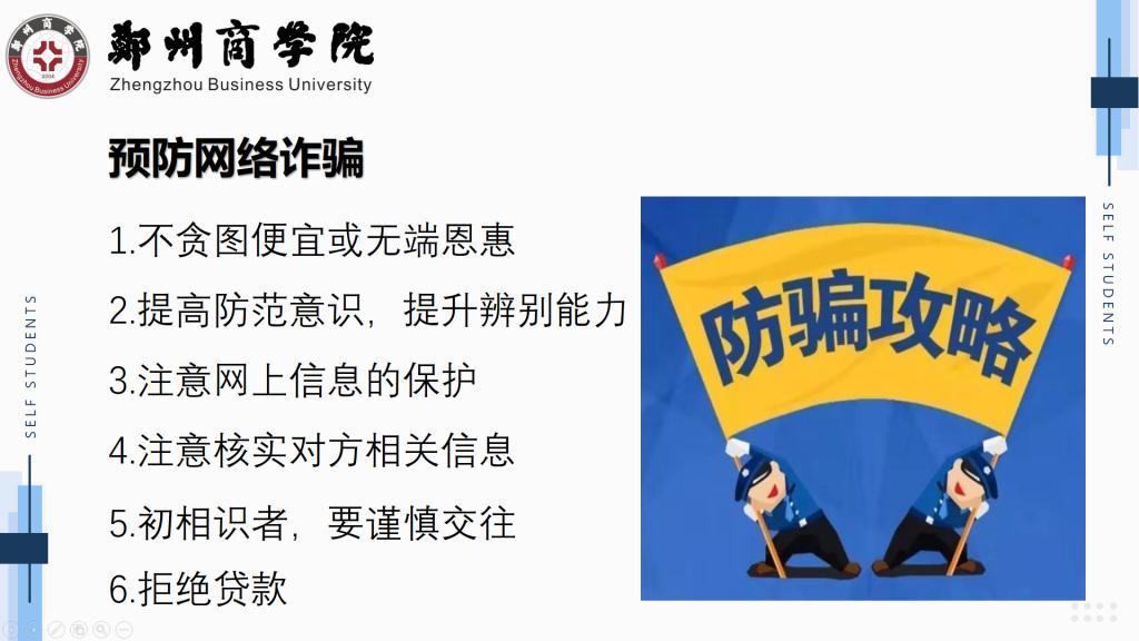 校园网络诈骗日剧严重,成为校园安全的一颗潜在毒瘤。其中,大学生开学季既是这颗毒瘤爆发的“高发季”。会议初,辅导员结合各大高校曾经发生过的的几起实际案例来引出今天得班会主题——防诈骗,其中又通过近日的时政、新闻等信息抛砖引玉,为同学们生动形象的科普了日常生活中的诈骗手段,让同学们学会预防电信诈骗,增强了同学们的防范意识,同时也提醒同学们有事找老师,有事找学院。