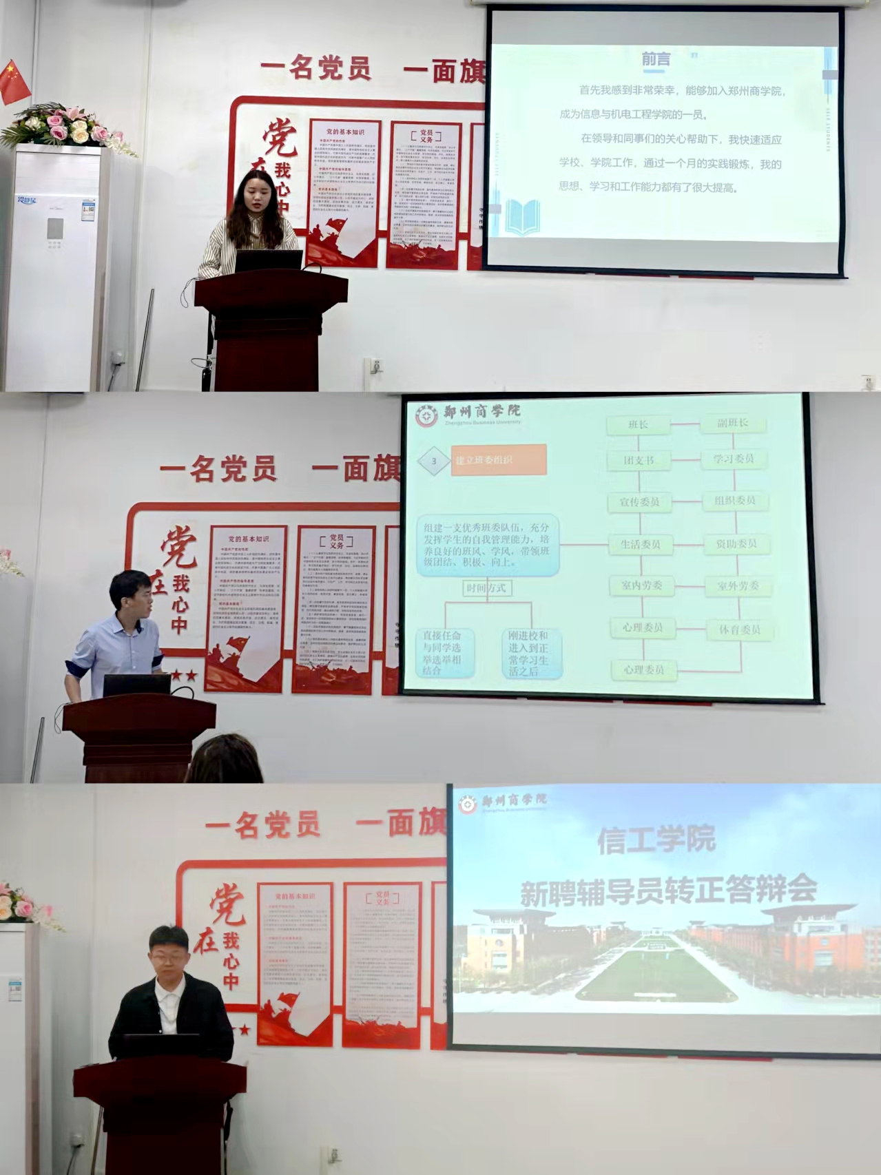 会上,周余书记代表院党委再次向新聘辅导员表示诚挚的欢迎,对新聘辅导员在入职以来所表现出的积极向上的精神面貌给予高度评价。随后,三位辅导员以此进行转正汇报。他们结合自身的工作实际,从学风建设、日常事务管理、思想政治教育、党团和班级建设、心理健康教育、个人成长和发展规划等方面进行了汇报。最后,周书记对转正答辩情况做详细的点评,从职业生涯规划、业务能力提高等方面提出了中肯的建议。
