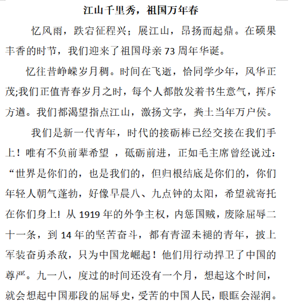 此次活动的圆满开展使全体学生将心中炙热的情感转化为文字,用文字的力量表达着对祖国的自信与骄傲,用文字写下了不负青春、不负党、不负国家人民的热血誓言,进一步展现了我院学子的青春风貌。