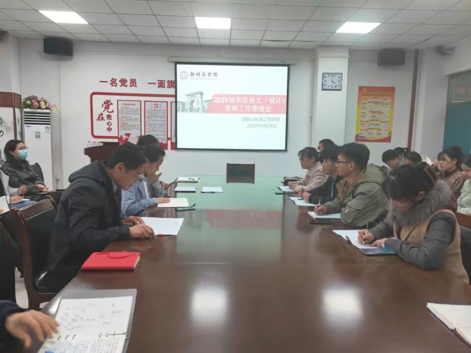 为确保我院2023届本科毕业论文(设计)答辩工作的顺利开展,按时、高质量完成各阶段工作。4月24日下午,信工学院在四号教学楼会议室召开了2023届毕业论文(设计)答辩工作推进会,张晓冬院长、院党委周余书记、张伟华副院长、各答辩组组长以及答辩秘书参加了本次会议。