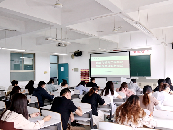 为深入贯彻落实党的二十大精神,高质量开展学习贯彻习近平新时代中国特色社会主义思想主题教育,夯实一线学生工作,不断提升辅导员理论素养、职业能力和育人实效,6月2日上午,信息与机电工程学院在4号教学楼409教室组织开展辅导员基础业务测试,全院共22名辅导员参考,学院党委书记周余、团委书记张璐阳担任此次辅导员业务测试的监考官。