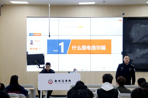 首先,贾警官从“什么是诈骗”进行知识引入,通过讲述真实办案经历,向学生们展现了现代诈骗分子的手段的多样性、复杂性。诈骗形式已由传统行骗到网络行骗的升级,使大家对当前新型网络诈骗有了更深的认识。