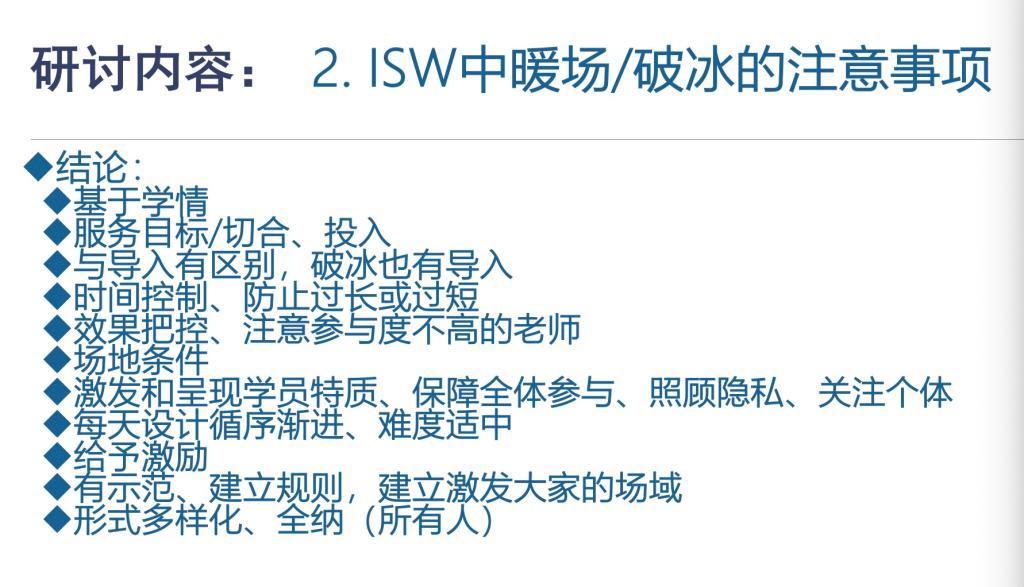 第二轮研讨要点是ISW中暖场/破冰的注意事项。强调要服务于教学目标,做到切合实际、全身心投入,且需与导入环节有所区别,同时要注意时间控制,避免过长或过短;要把控效果,关注参与度不高的教师;根据场地条件合理安排;激发和呈现学员特质,保障全体参与,照顾隐私,关注个体;每天的设计应循序渐进、难度适中,并给予激励,建立规则,营造激发大家积极性的场域,要有示范且形式多样化,确保全纳(所有人)参与。