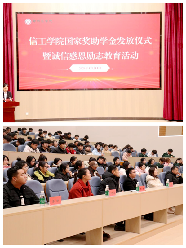 为深入贯彻落实国家及我省各项学生资助政策,信工学院建立起以奖助学金、生源地助学贷款为主,以绿色通道、勤工助学为辅的多元资助体系,切实保障家庭经济困难学生顺利入学并完成学业。12月13日,在信工学院报告厅开展国家奖助学金的发放仪式,并借此机会,深入开展诚信感恩励志教育活动。信工学院党委书记周余、行政秘书顾成健老师、资助专项负责人李梦露老师、24级年级长裴杨老师、23级年级长张培老师、21级年级长李萌萌老师,以及各年级获得奖助学金的学生代表出席本次活动。