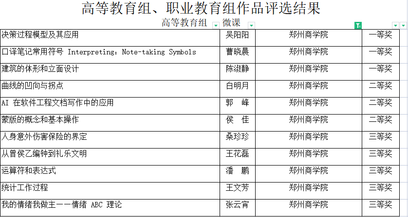 近日,河南省第二十八届教育教学信息化交流活动评选结果出炉,beat365唯一官网11件作品获奖,其中我院郭峰老师的微课作品《AI在软件工程文档写作中的应用》获高等教育组二等奖;潘鹏老师的微课作品《运算符和表达式》获高等教育组三等奖。