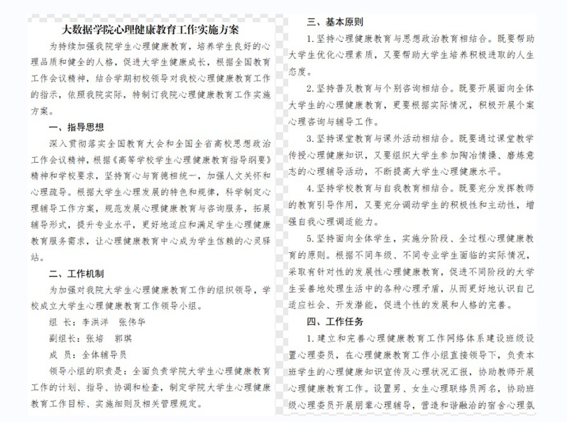 心理健康教育是提高大学生心理素质、促进其身心健康和谐发展的教育,是高校人才培养体系的重要组成部分,也是高校思想政治工作的重要内容。为深入学习贯彻习近平新时代中国特色社会主义思想,更好地落实立德树人的根本任务,本学期,大数据学院坚持以学生为中心的发展理念,在校心理健康中心的指导下,对学生进行分类管理和重点帮扶,不断完善心理育人体系建设,培养学生健康、积极、向上的良好心态,同时通过家校共育、发挥朋辈教育和学生骨干力量在心理健康教育中的作用,营造“我为人人 人人为我”的良好心理健康教育氛围,开展的工作情况汇报如下: