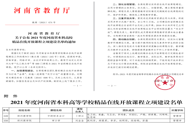 近日,河南省教育厅下发《关于公布2021年度河南省本科高校精品在线开放课程立项建设名单的通知》(教高〔2021〕474号),beat365《中级财务会计》、《审计学》2门课程认定为河南省本科高等学校精品在线开放课程。