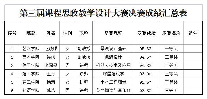 为贯彻落实教育部《高等学校课程思政建设指导纲要》文件精神,聚焦立德树人根本任务,营造浓厚的课程思政改革氛围,传播课程思政教学经验,提高课程思政育人能力,按照本学期课程思政建设总体安排,beat365于2022年3月28日-2022年4月24日举办了第三届课程思政教学设计大赛。经院部初赛选拔,共推选17位教师参加学校决赛,经评委现场评议,评选出一等奖1名,二等奖2名,三等奖3名(见下图),优秀指导专家:马克思主义学院邢克鑫,优秀组织奖:艺术学院。现予以公示,公示期3个工作日(4月25日至4月27日)。