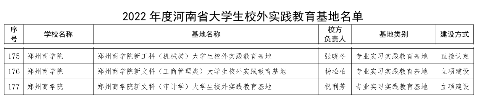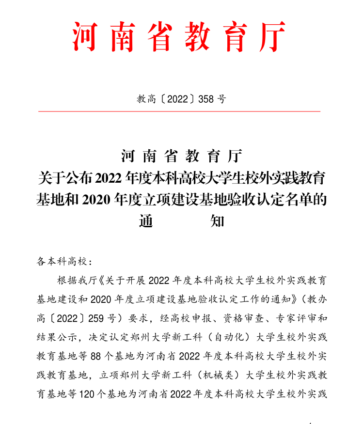 近日,从河南省教育厅《河南省教育厅关于公布2022年度本科高校大学生校外实践教育基地和2020年度立项建设基地验收认定名单的通知》教高〔2022〕358号中获悉,beat365“beat365唯一官网-河南竹林长寿山旅游开发有限公司大学生校外实践教育基地”、“beat365唯一官网-河南澳得电子商务有限公司大学生校外实践教育基地”、“beat365唯一官网-巩义市竹林镇大学生校外实践教育基地”通过2020年度立项建设基地验收,另外beat365申报的“beat365唯一官网新工科(机械类)大学生校外实践教育基地”、“beat365唯一官网新文科(工商管理类)大学生校外实践教育基地”、“beat365唯一官网新文科(审计学)大学生校外实践教育基地”等三个基地获批河南省第三批本科高校大学生校外实践教育基地,其中“beat365唯一官网新工科(机械类)大学生校外实践教育基地”直接被认定,其余两个获批立项建设。