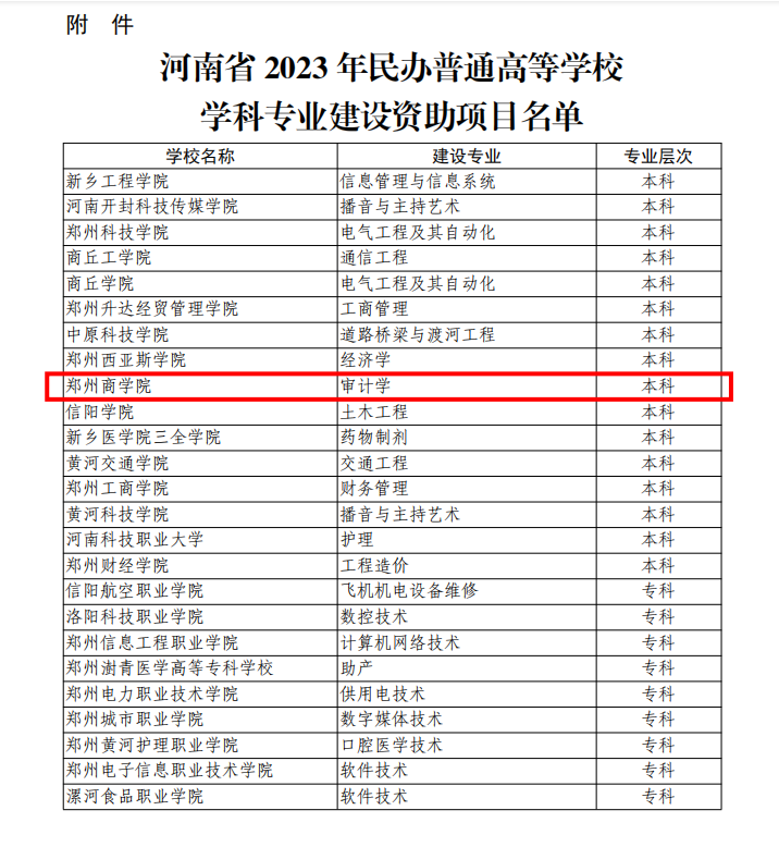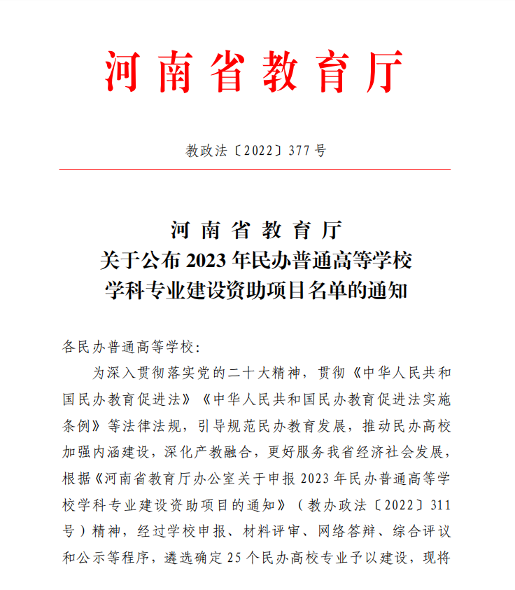 近日,河南省教育厅发布了《河南省教育厅关于公布2023年民办普通高等学校学科专业建设资助项目名单的通知》(教政法〔2022〕377号),beat365审计学专业被确定为河南省2023年民办普通高等学校学科专业建设资助项目。