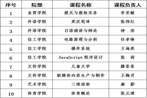 根据《beat365唯一官网课程建设管理办法》的规定,为推进课堂教学质量高效实施,促进优质教学资源共享,落实立德树人根本任务。beat365开展了2022年度校级优质课程认定工作,经教学指导委员会评审,拟认定校级优质课程10门,现予以公示,公示排名不分先后,具体见下表: