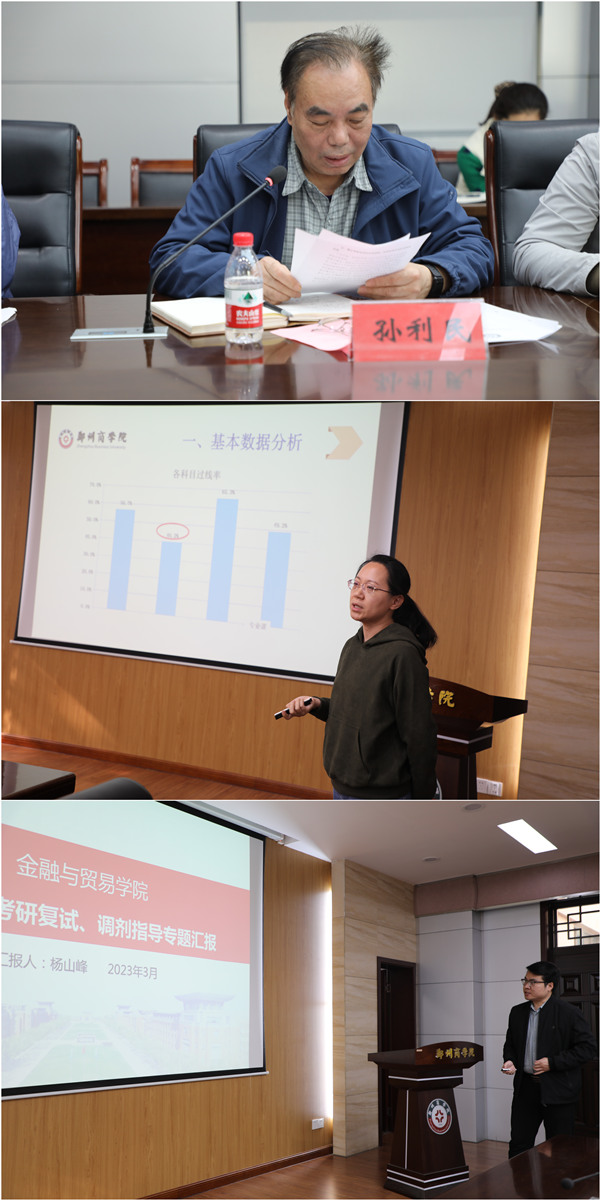 汇报环节,信工学院、建工学院和金贸学院作为beat365学院代表对2023届毕业生考研复试指导及调剂帮扶工作进行汇报。张晓冬院长、孙利民院长和杨山峰院长分别从考研学生基本数据分析、复试辅导具体工作安排等方面总结近期对考研复试学生的帮扶工作,通过一系列积极有效帮扶措施,确保考研复试学生顺利上岸。
