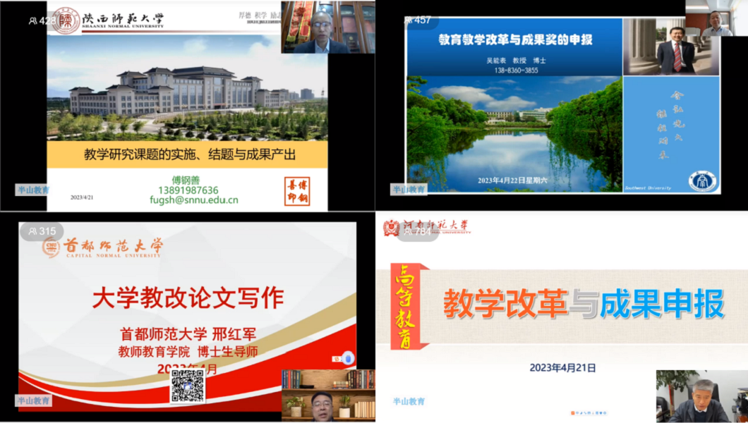 本次培训由河南师范大学教务处处长梁存良教授、陕西师范大学国家教学名师傅刚善教授、西南大学教务处处长吴能表教授、首都师范大学邢红军教授主讲。梁存良教授围绕高校教师教改项目凝练与申报的策略这一主题,从国家出台的系列高质量教育体系建设文件的解读出发,结合自身团队申报、建设的教改项目经历,详细讲述了教改项目选题、建设与成果申报的具体要求、方法和建议。傅刚善教授从教学研究课题的科学实施、教学研究课题的对标结题以及教学成果的内涵与产出三个方面深入剖析了教改项目成果凝练的基本原则、基本要求和技巧。吴能表教授从人才培养模式的角度阐述了教改的思路、方案的编制、成果的来源,介绍了以人才培养模式的改革为基础的经典教改案例。邢红军教授作题为教学改革论文写作与发表技巧的精彩报告,报告围绕为什么要写教改论文、教改论文的写作策略两个方面,重点阐释了教改论文写作中需注意的六点要求。