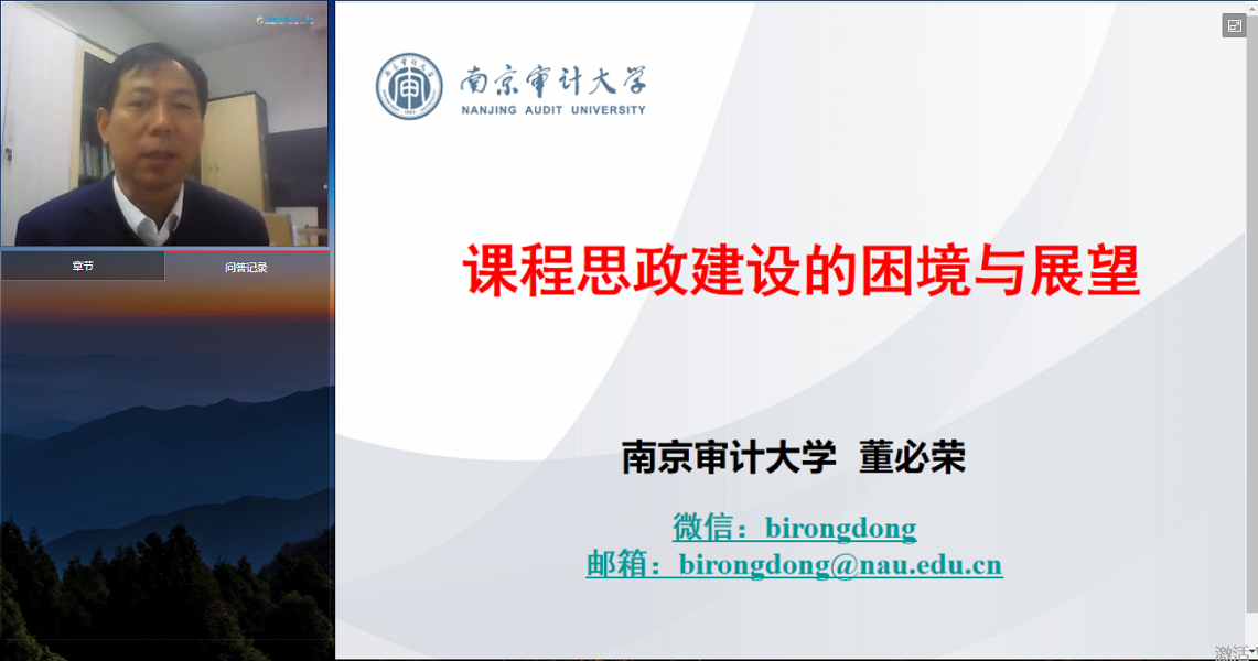 南京审计大学副校长董必荣作题为《课程思政建设的困境与展望》的报告。董教授从课程思政的本质、课程思政的认识误区、课程思政的建设困境、课程思政建设的趋向与挑战和该如何推进课程思政建设等五个方面进行了详细的阐述,并结合国家级课程思政示范课程《会计学》建设实践,分享了课程思政建设的具体实施路径。