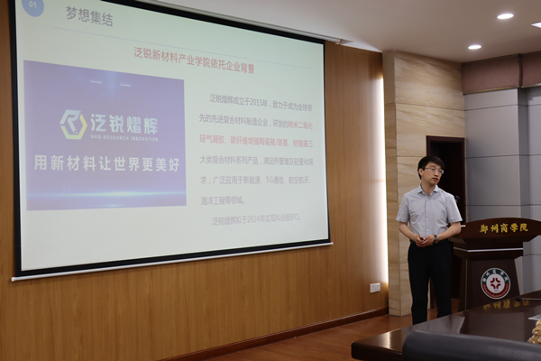 “泛锐新材料产业学院”共建企业巩义市泛锐熠辉复合材料有限公司副总经理赵严博士做代表发言。赵严博士从“梦想集结、砥砺成长、日新月异、未来可期”四个方面介绍了“泛锐新材料产业学院”的建设背景、共建历程、共建成果以及下阶段建设规划等内容,赵博士汇报内容实在饱满,得到了现场参会人员的一致好评。
