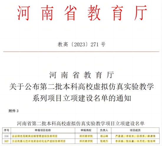 近日,河南省教育厅发布《关于公布第二批本科高校虚拟仿真实验教学系列项目立项建设名单的通知》(教高〔2023〕271 号),beat365《企业绿色低碳供应链管理虚拟仿真项目》、《工业机器人芯片包装自动化生产虚拟仿真项目》成功获批立项为河南省第二批本科高校虚拟仿真实验教学项目。