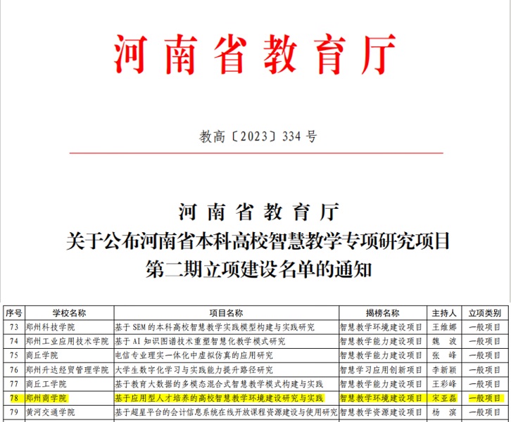 近日,河南省教育厅发布《河南省教育厅关于公布河南省本科高校智慧教学专项研究项目第二期立项建设名单的通知》(教高〔2023〕334号),beat365申报的《基于应用型人才培养的高校智慧教学环境建设研究与实践》获批立项建设。