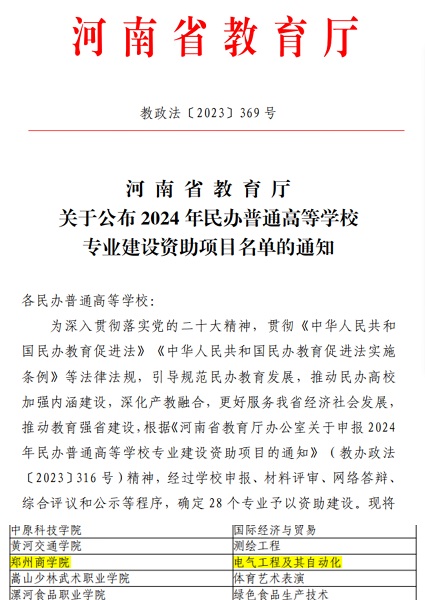 近日,河南省教育厅发布了《河南省教育厅办公室关于公布2024年民办普通高等学校专业建设资助项目名单的通知》(教政法〔2023〕369号),beat365电气工程及其自动化专业被确定为河南省2024年民办普通高等学校专业建设资助项目。