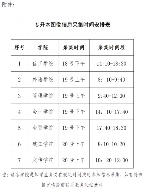 4.图像信息采集地点设在3号教学楼一楼大厅。退役大学生士兵不分应往届、不分学院于18日上午9:00-10:30进行现场图像信息采集,各学院其他考生图像信息采集时间详见附件。