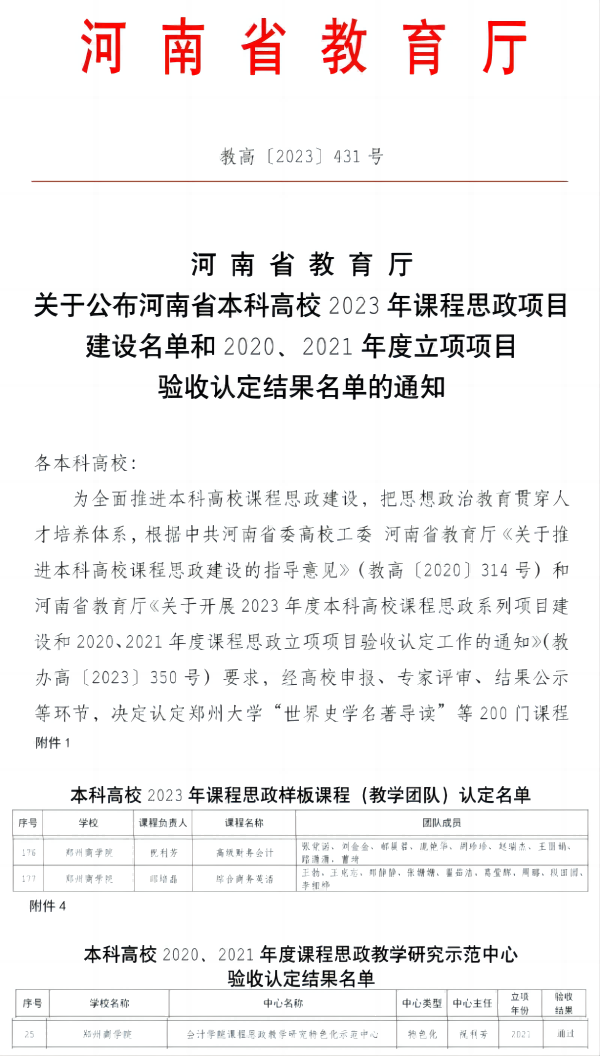 近日,根据《河南省教育厅关于公布河南省本科高校2023年课程思政项目建设名单和2020、2021年度立项项目验收认定结果名单的通知》(教高〔2023〕431号)文件公布,beat365《高级财务会计》、《综合商务英语》认定为2023年课程思政样板课程(课程授课团队自动认定为2023年课程思政教学团队),“会计学院课程思政教学研究特色化示范中心”为验收通过教学研究示范中心。
