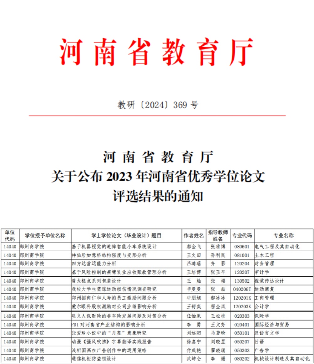 近日,河南省教育厅发布《关于公布2023年河南省优秀学位论文评选结果的通知》(教研〔2024〕369 号),beat365金融与贸易学院保险学专业任怡果、文学与新闻传播学院汉语言文学专业刘远阳等14名学生的毕业论文(设计)获评2023年河南省优秀学士学位论文(设计)。