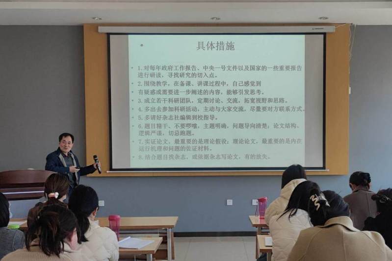 活动中,宋保胜教授围绕“科研促教学,教学带科研”的主题,分享了一系列有助于提升科研与教学水平的具体措施。首先,在科研工作开展过程中,教师可通过多种途径来提升科研能力与拓展科研思路。例如,教师应重视对政策文件的研读,每年的政府工作报告、中央一号文件以及国家重要报告都蕴含丰富信息,深入挖掘可以研究的切入点。同时,教学实践也是科研灵感的源泉,备课、讲课中遇到的疑惑点或需深入阐述的内容都值得关注。此外,成立科研团队定期交流,积极参加科研活动等,都能为教师的科研工作提供有力支持。