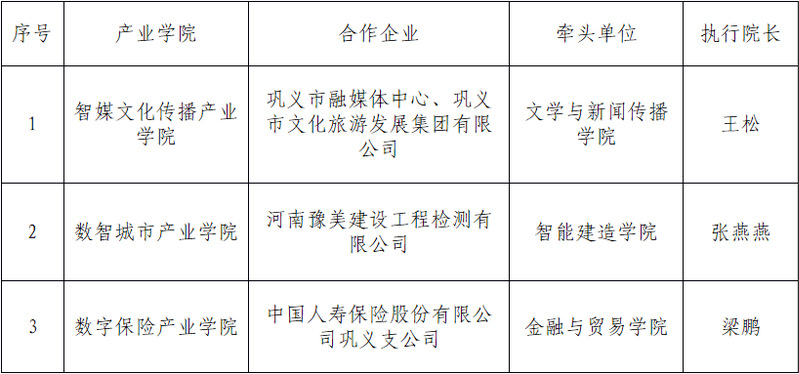 为深入贯彻国家关于深化产教融合的战略部署,落实《河南省教育厅等部门关于推进高等学校产业学院建设的指导意见》豫教发规〔2021〕44号文件精神,学校立足应用型高校办学定位,持续深化人才培养模式改革,着力提升服务区域经济社会发展能力。经学院自主申报、现场汇报评审等程序,现将第三批校级产业学院拟立项建设名单予以公示: