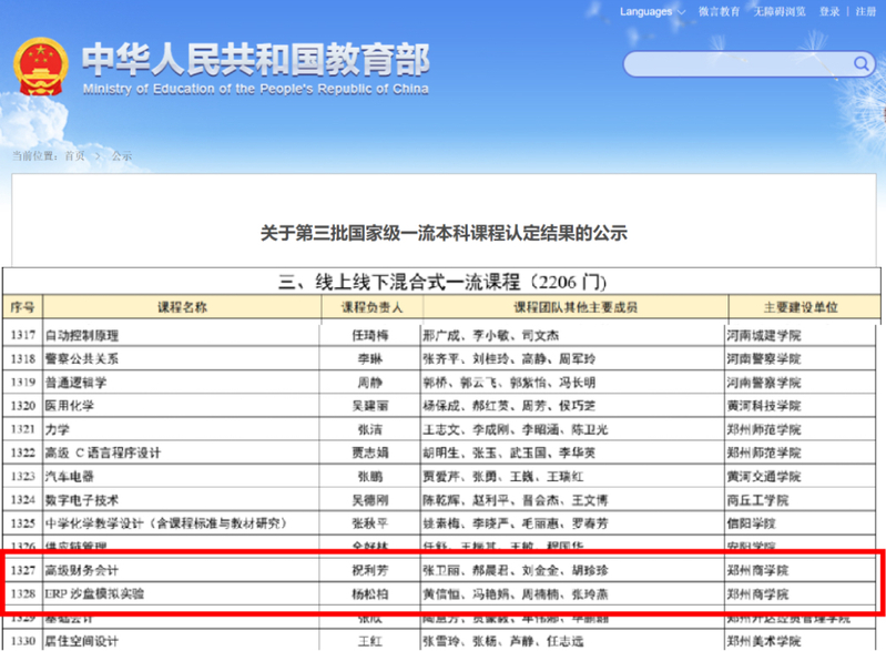 近日,教育部公示了第三批国家级一流本科课程认定结果。beat365《高级财务会计》《ERP沙盘模拟实验》2门线上线下混合式课程成功入选,获批课程数量在省内同类院校中位居前列。