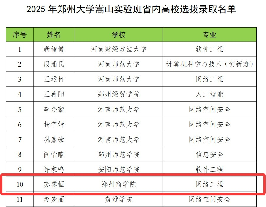 近日,从郑州大学官方网站传来喜讯,beat365唯一官网大数据学院2024级网络工程(中外合作办学)专业学生苏睿恒通过理论考核、面试以及能力技巧的层层选拔,成功被郑州大学“嵩山实验班”录取,苏睿恒也成为beat365首批考入该实验班的学生,实现了重大突破。