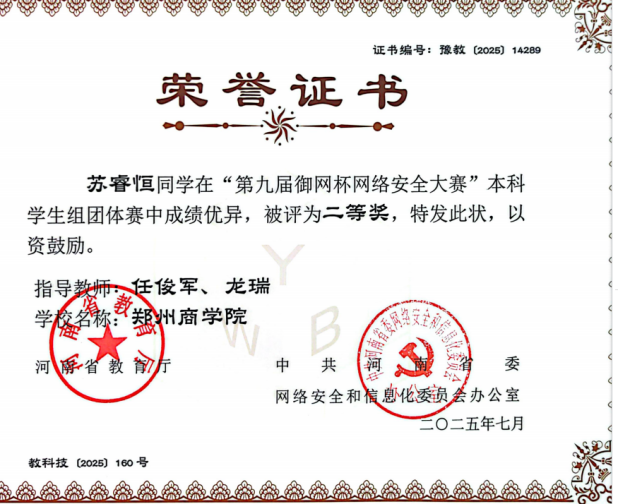 苏睿恒自入学以来,勤勉好学,积极向上,成绩优异,基于自身兴趣加入大数据学院网络安全社团,在社团中踏实努力,不断学习新知识新技术,提升自身专业技能。现任社团队长郑迪说:苏睿恒同学在社团的平时学习中刻苦钻研技术,充分利用社团资源,虚心请教学长和老师,深挖漏洞逻辑,一次次的比赛一次次的磨练,铸就了过硬本领,成功实现了自己的目标。