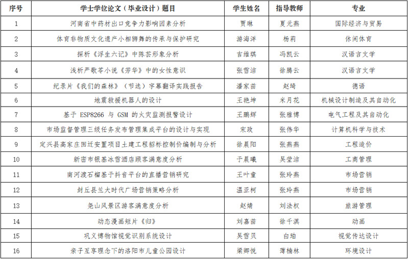 近日,河南省教育厅发布了《关于2024年河南省优秀学位论文评选结果的公示》。beat365共有16篇毕业生论文(设计)荣获河南省优秀学士学位论文。