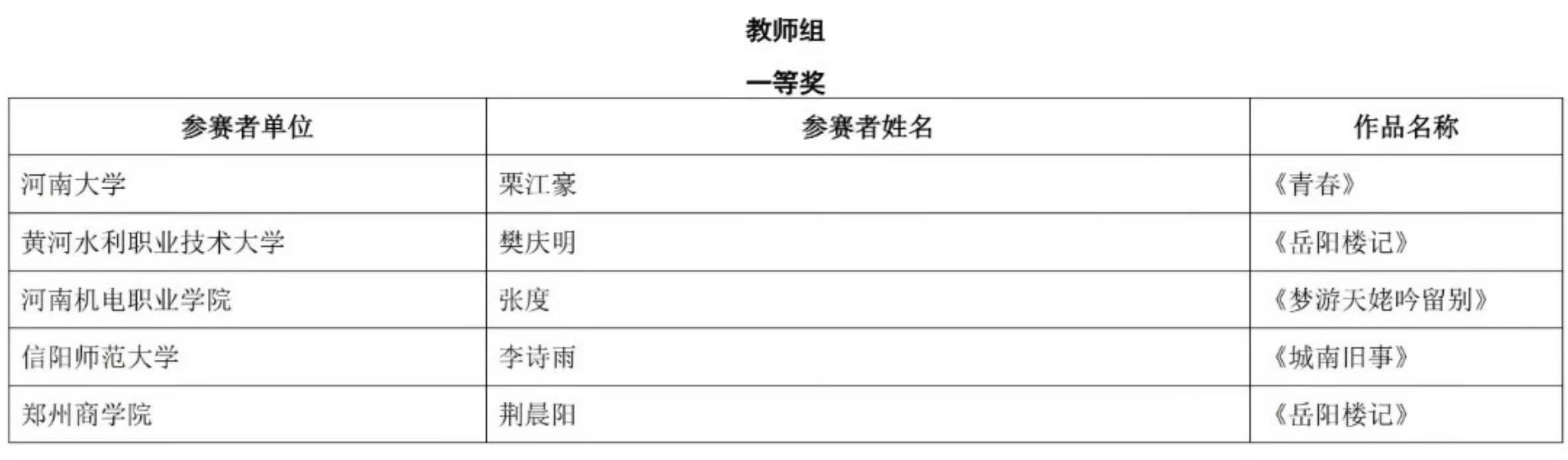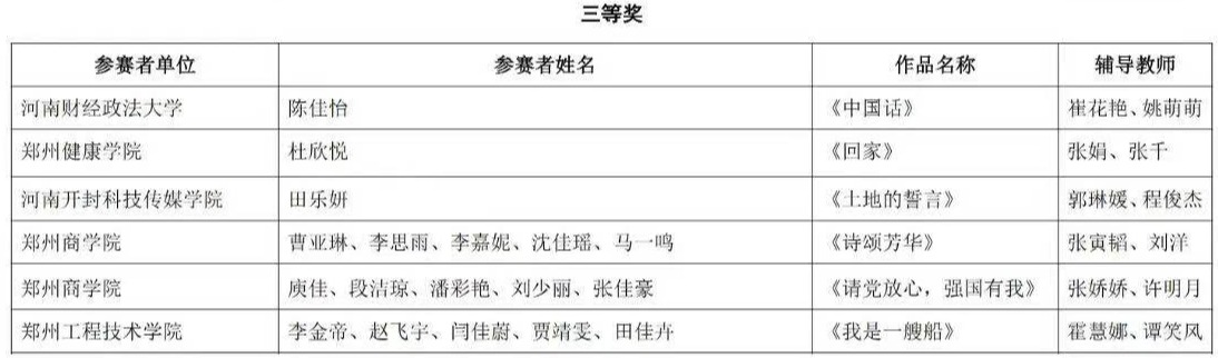其中,荆晨阳老师参赛的作品《岳阳楼记》在教师组比赛中脱颖而出,荣获一等奖。由张娇娇、许明月老师指导,庾佳、段洁琼、潘彩艳、刘少丽、张佳豪同学参赛的作品《请党放心,强国有我》、由张寅韬、刘洋老师指导,曹亚琳、李思雨、李嘉妮、沈佳瑶、马一鸣同学参赛的作品《诗颂芳华》荣获大学生组三等奖。