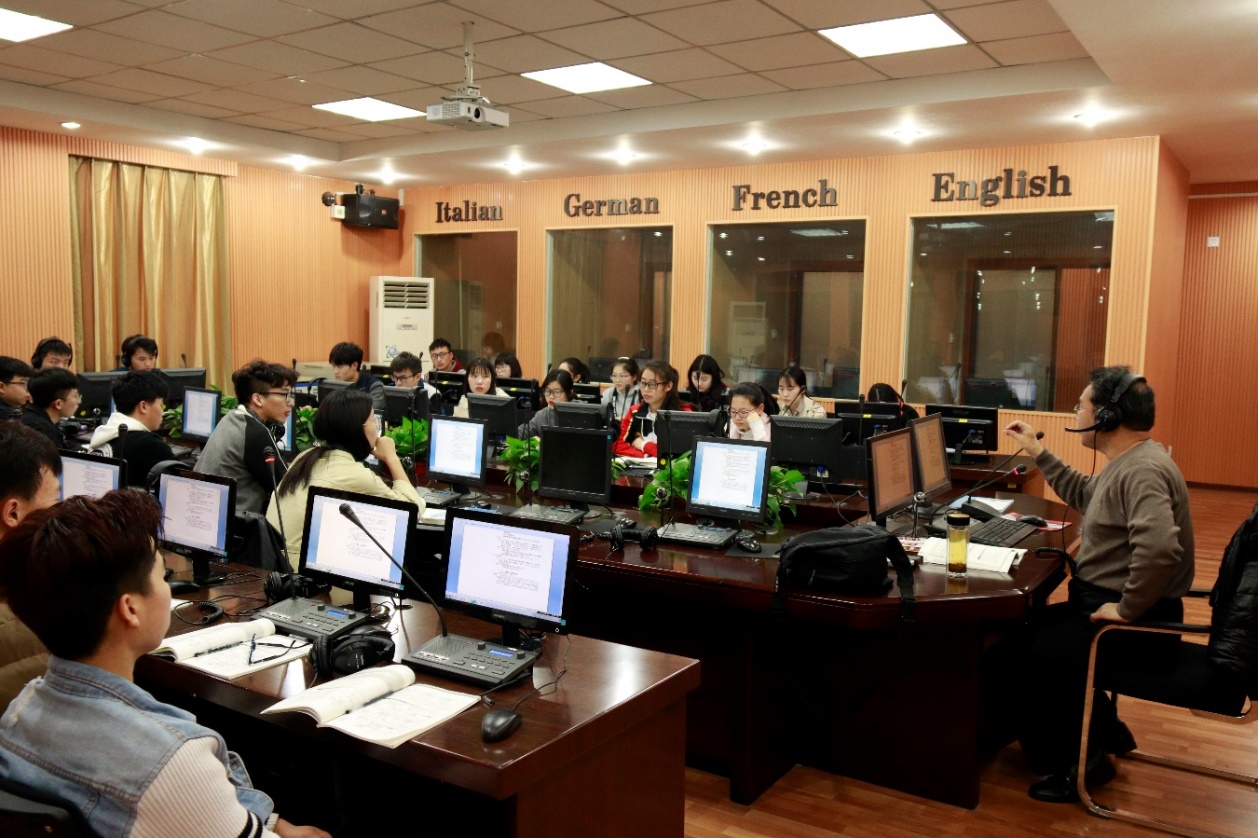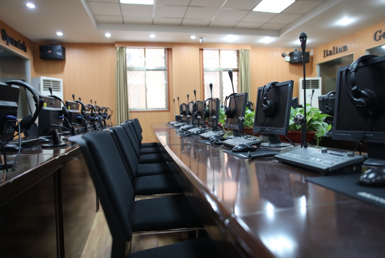 同声传译实验室可满足8种语言的同声传译:英、法、德、意、日、韩、俄、西班牙语。实验室还承担了全国商务英语翻译资格认证考试和相关的口译比赛等工作,学生在全国各级演讲、口译、辩论、翻译、商务英语实践大赛等赛事中屡创佳绩。