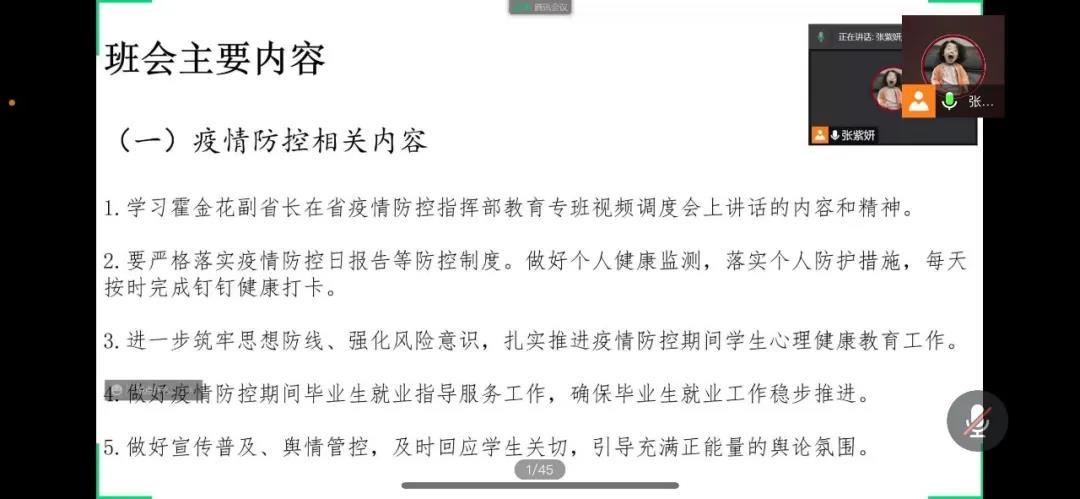 班会主要分为三个部分:一是领学霍金花副省长对疫情防控指挥部教育专班视频调度会上的讲话内容;二是学习省教育厅转发关于启动重大气象灾害的应急通知;三是对班会进行总结,并对日常工作进行布置。