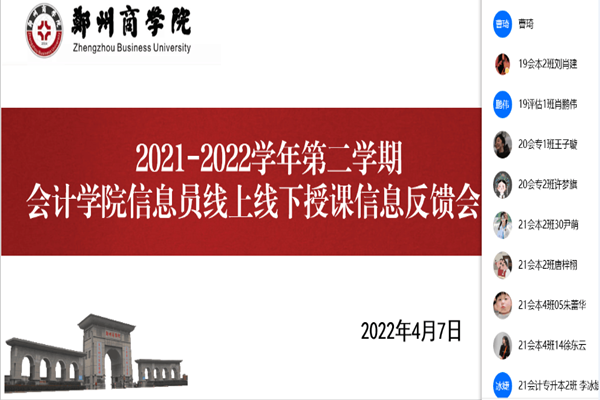 为进一步加强我院教师与学生之间的联系,强化师生间的交流,关注线上授课质量,营造良好的学习氛围4月7日会计学院召开了线上“2021-2022学年第二学期信息员线上线下授课信息反馈会”会议。会计学院祝利芳院长、刘金金副院长、院部质监员曹琦老师,学习部成员及班级信息员参加此次会议