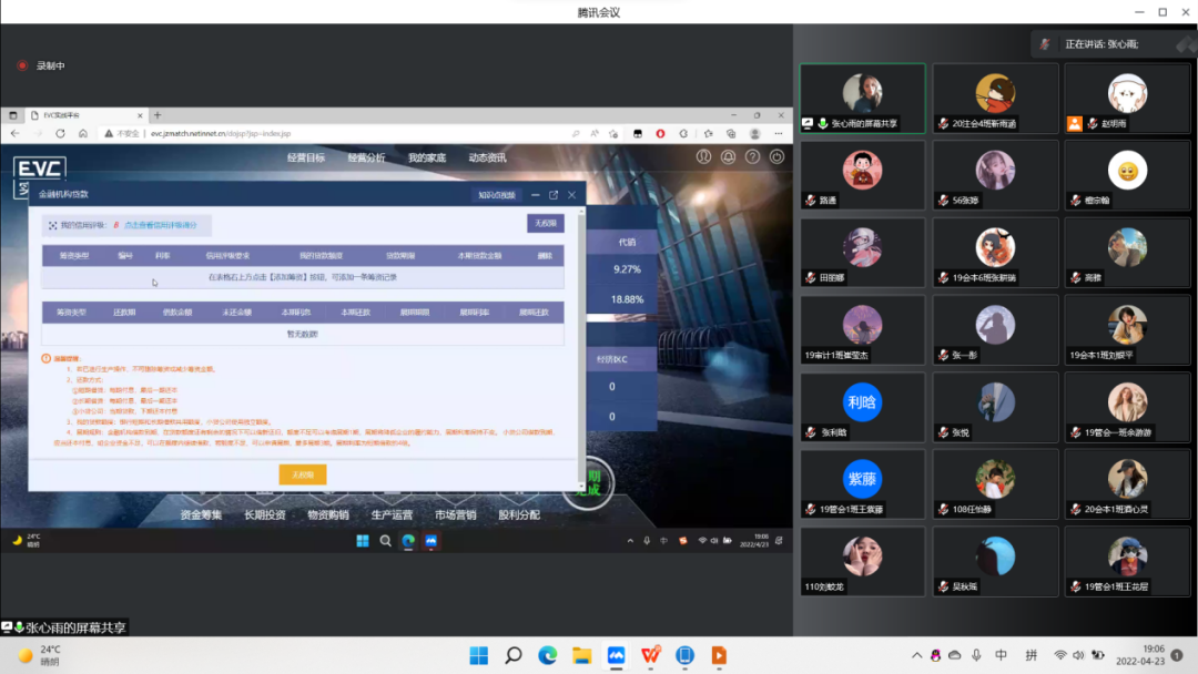 随后,张心雨同学分别从资金筹集、长期投资、物货购销、生产运营、市场营销、股利分配等方面介绍平台的所有权限以及注意事项。