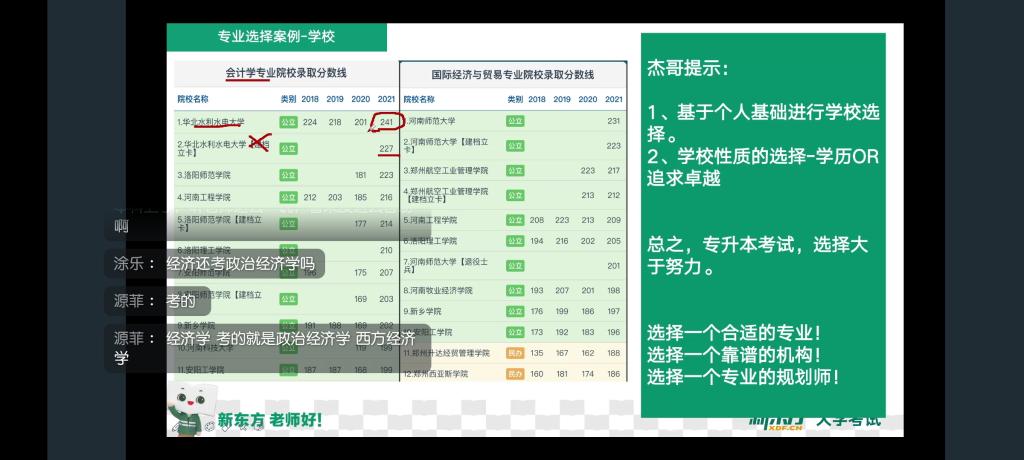 会议伊始,河南省专升本项目教学主管、河南大学英语教育硕士李杰老师以风趣幽默的语言风格做了简单的自我介绍,李杰老师从事专升本教龄已有5年,累计指导专升本学生志愿填报人数1300+,她希望参会的学生能够认真聆听,充分利用好本次交流机会,汲取专升本备考、填报经验,踏实奋进,用奋斗来书写青春。并且李杰老师也非常注意线上直播中与同学们的互动交流,在互动环节中,大家纷纷积极踊跃地向李杰老师提出有关备考、志愿填报、后续录取等方面的相关问题,她一一作答并且将其经验倾囊相授。