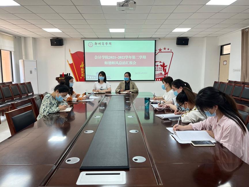 为进一步加强师德师风建设和教师职业道德修养,提升教师教书育人、为人师表的自觉性,树立教师形象,全面提升教学质量,2022年4月25日下午,会计学院院长祝利芳,副院长刘金金、评估组负责人曹琦以及质量监控小组成员参加此次总结汇报会。