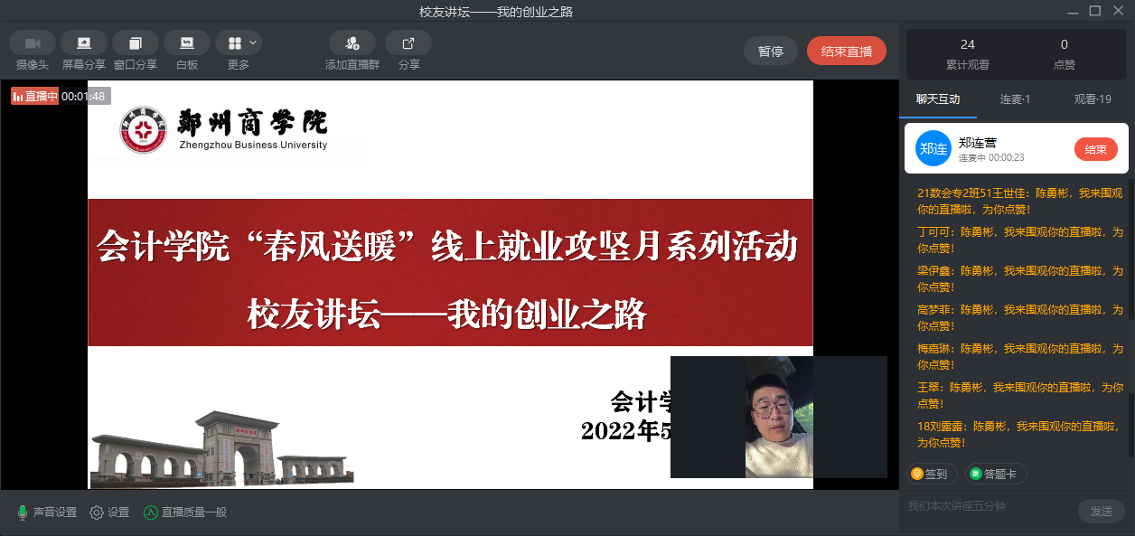 为深入贯彻落实学校就业创业安排部署,持续推进我院线上就业攻坚月系列活动,多措并举促进我院2022届毕业生顺利毕业、尽早就业,实现我院学生高质量就业目标。5月1日,会计学院通过组织开展“春风送暖”线上就业攻坚月系列活动——我的创业之路。本次讲座由我院2019届优秀毕业生郑连营学长主讲。