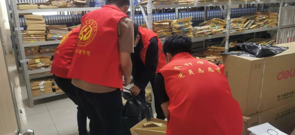 在党支部书记陈勇彬同志的带领下,马文超,李泽晖,王浩,刘富双等几名学生党员积极参与其中。活动开始,支部书记陈勇彬同志向大家介绍此次协助整理和搬运的要求。此后整个过程中,大家干劲十足、通力协作,发扬了不怕脏、不怕累的精神,充分展现了能吃苦、挑重担的风貌。党员们协助老师进行整理、分类、搬运,他们不怕苦、不怕累,认真投入到志愿服务工作中,经过不懈的的努力,档案已全部从广恩楼113搬运至广恩楼517,档案整理有序,档案室的环境焕然一新。