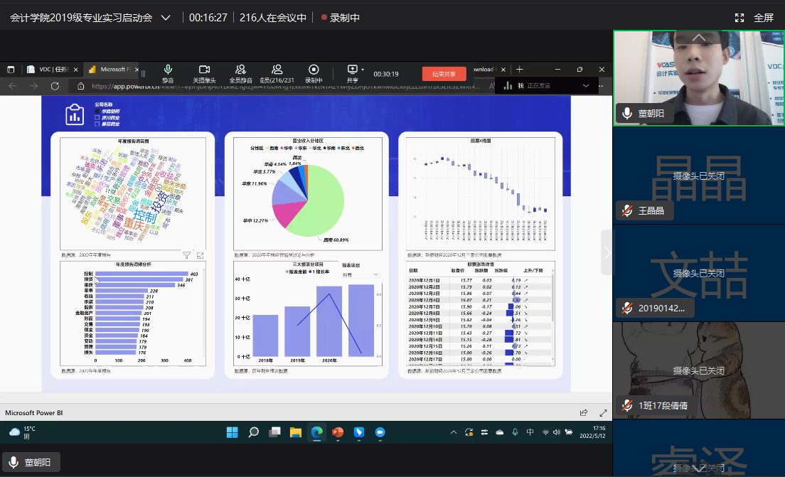 线上专业实习时,跃客科技技术部经理董朝阳为参加专业实习的学生进行专题培训,董经理首先介绍了Power BI工具,并结合具体案例运用Power BI工具对财务数据进行分析处理;其次运用BI工具对具体企业进行杜邦分析:最后通过VDC平台获取数据资源,利用Power BI工具进行数据分析。