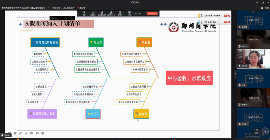 祝利芳院长从机构设置、条件保障、队伍建设、工作特色效果、下一步发展规划、本学期中心建设推进六个方面展开分享。她首先指出,学校在政策保障、硬件设施和活动组织上给予了研究中心强有力的支持。研究中心组建了职称结构合理、教育教学改革经验丰富的研究团队,重点在搭平台、组队伍、建课程、拓资源、做培训等方面下足功夫。其次祝院长提出要扎根课程,在凝练“商科、应用型、国际化”特色课程思政教学体系的基础之上,广泛开展课程思政教学资源库建设,将思政元素、思政案例融入到教案、大纲当中,并邀请国内一流专家学者面向全体教师开展课程思政业务能力培训,开展多层次的课程思政教学技能大赛等。课程思政教学研究特色化示范中心的建设有效地提升了课程思政建设的内涵水平,营造了课程思政全面推进的氛围,未来将在理念层、制度层、路径层、手段层四个方面继续扎实开展课程思政示范中心建设。