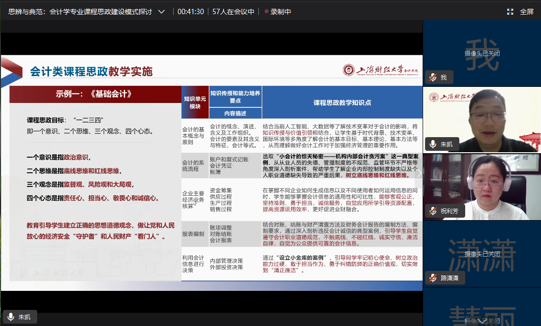 在报告中,朱凯教授以“课程思政建设思路”为中心,介绍了会计类课程思政建设思路,并分享了上海财经大学会计学院的具体教学案例。朱教授指出,课程思政建设作为落实立德树人根本任务的关键环节,可以从教学目标、教学设计、教学活动实施与教学评价着手。同时,他还分享了课程思政的建设路径——组建“课程组”;深度挖掘专业知识中的思政元素,凝练“教学案例”;打造课程思政“微课程”;编制《会计学课程思政教学指南》。报告最后,朱教授分享了上海财经大学《基础会计》等课程的思政建设示例。
