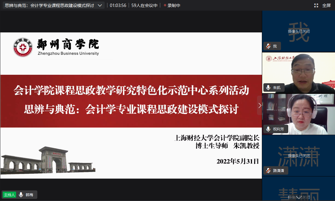 为推进“会计学院课程思政教学研究特色化示范中心”活动的深入开展,切实加强教师教育教学能力提升,不断推进学院课程思政高质量建设,提高课程思政育人效果,2022年5月31日,我院特邀请上海财经大学会计学院副院长、博士生导师朱凯教授莅临钉钉会议为我院老师做学术报告并深入交流探讨,报告主题为《思辨与典范:会计学专业课程思政建设模式探讨》。会计学院祝利芳院长、刘金金副院长及全体无课教师齐聚钉钉视频会议,共享学术盛宴。