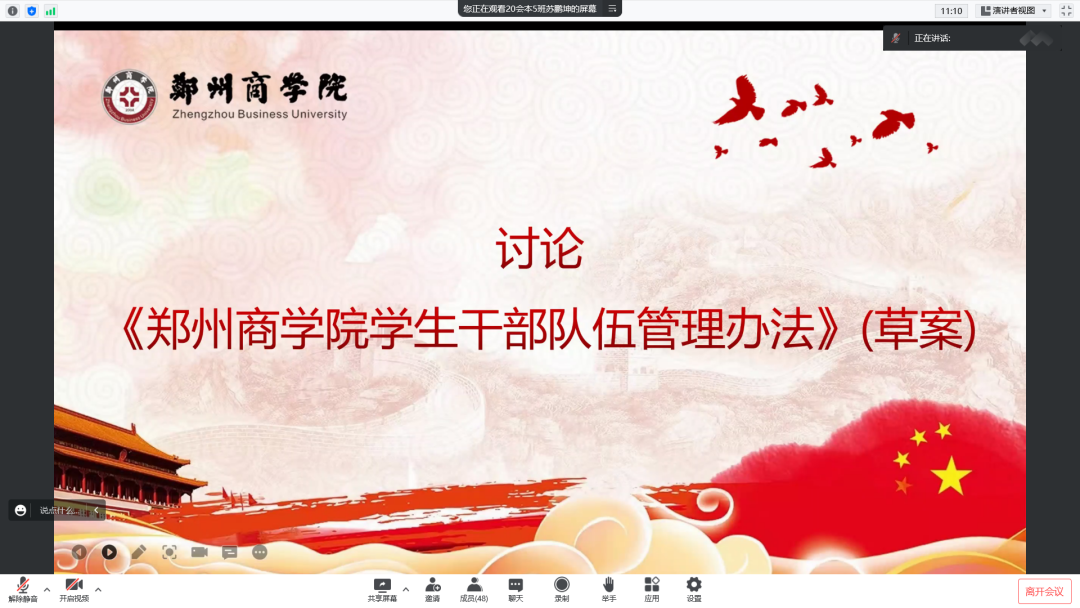 第三部分,围绕“十四五”开局,持续深化高校共青团改革,加强和改进beat365学生会工作认真讨论了《beat365唯一官网学生干部队伍管理办法》(草案),积极探讨学生队伍的建设方法。