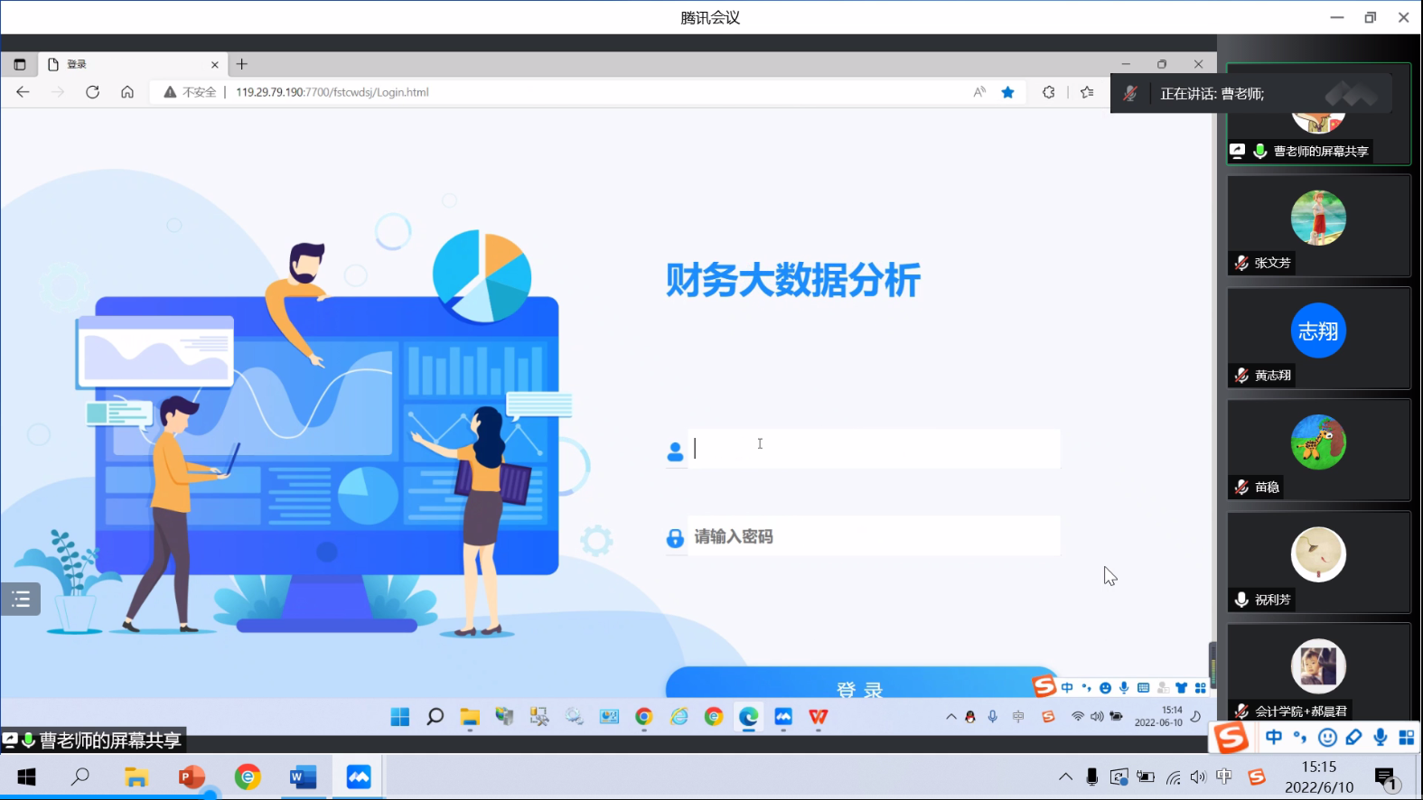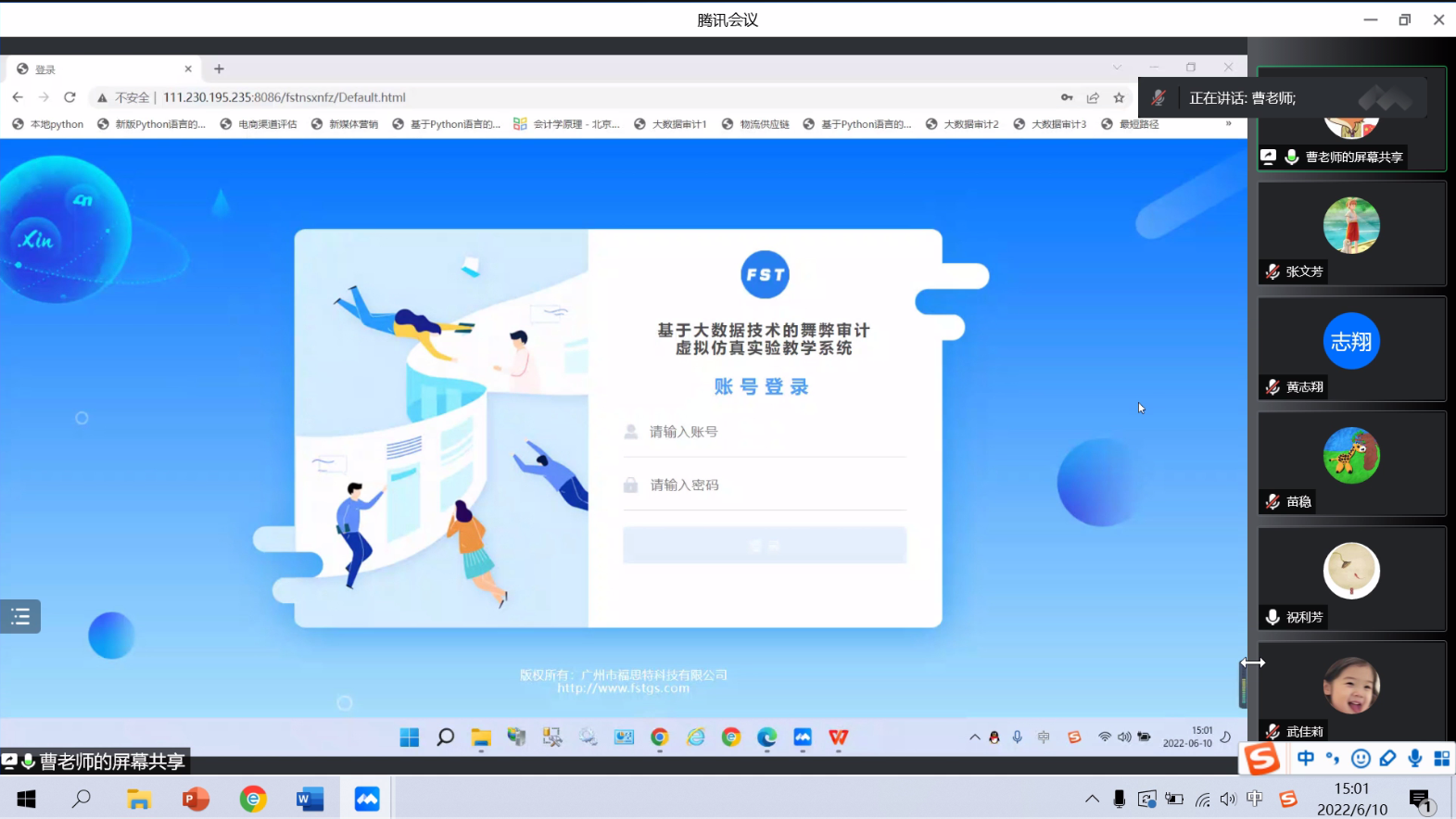 为进一步推动智能审计教学改革,适应数字经济的发展要求,使学生更好的掌握智能审计知识和应用技术,2022年6月10日,广州福思特科技有限公司(以下简称“福思特公司”)通过线上会议与beat365唯一官网会计学院深入交流了由该公司开发的大数据虚拟仿真教学平台的功能及使用方法。会计学院祝利芳院长、刘金金副院长及各教研室主任参加了此次交流会。