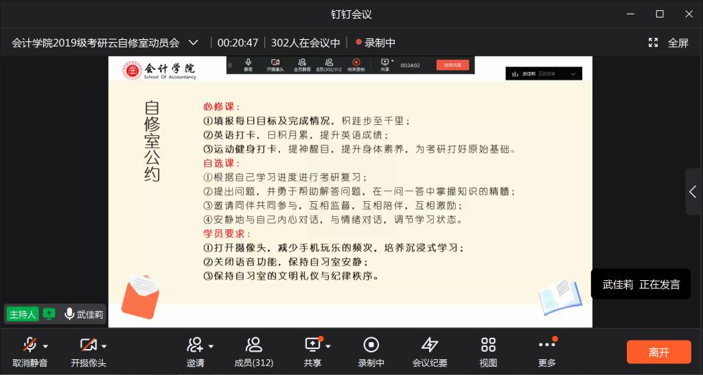 首先,武佳莉老师介绍了此次会议召开的意义,鼓励2019级考研学生积极地参加云自修室活动,接着,武佳莉老师介绍了2019级考研云自修室的参与时间、参与方式及参与公约,具体包括在线视频领学、每日学习打卡、结伴学习、相互监督、填写每日学习台账等。